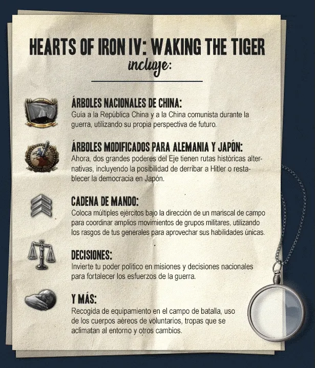 Waking the Tiger es la nueva expansión del aclamado juego de estrategia de la II Guerra Mundial Hearts of Iron IV, de Paradox Development Studio. Esta expansión ofrece nuevas opciones de mecánica de juego para todos los jugadores, y centra su atención en el frente asiático dentro de la guerra más letal de la historia de la humanidad.