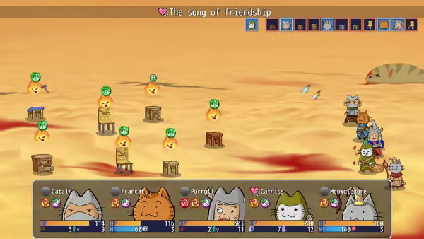 The game features tons of epic turn-based jRPG fights, where you will have an opportunity to use dozens of such unique cat techniques as Boot to the Head, Slipper Comet or a Hairball of Darkness. The characters represent traditional classes such as meowsassin, meowmage and purrior. With their powers combined, they are able to face adversities such as student internships and unpaid overtime.