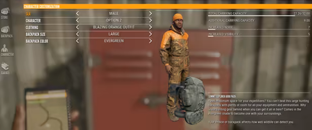 The main advantage of getting a backpack is that it increases your inventory space when you are travelling. The increased space gives you the opportunity to take more weapons, ground blinds and/or any items from your storage along on your hunt. But be careful - the backpack you use has a direct impact on your hunt. The larger the backpack you carry, the more visible you are to animals and the more noise you make when traveling by foot.