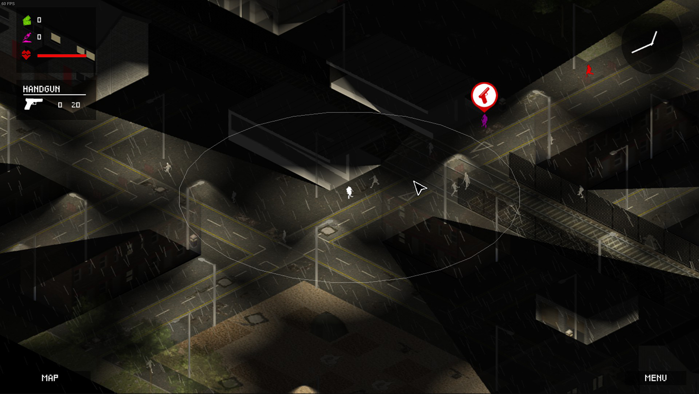 Open-World Isometric action. Bleak, moody isometric graphics set the scene as you ride between endless procedurally generated, open world levels. Explore the streets to find arms dealers, drug dealers, customers and most importantly – the target.