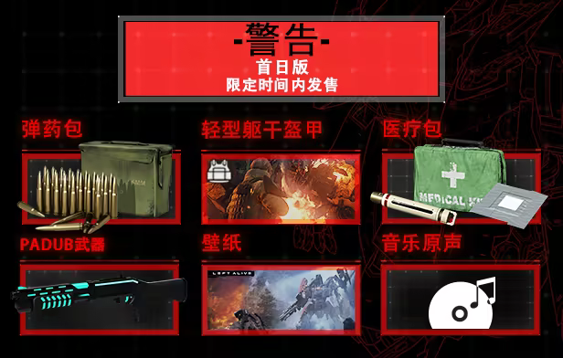 《LEFT ALIVE》首日版将在限定时间内发售。首日版包括以下奖励内容: