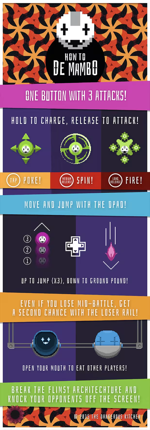 De Mambo lets 1-4 players engage in Mambo Combat. Charge your measly one button and release at different times to do three different attacks! Knock your opponents off the screen and break the level however you decide (thanks to some flimsy architecture), to make your game marginally different each time you play.