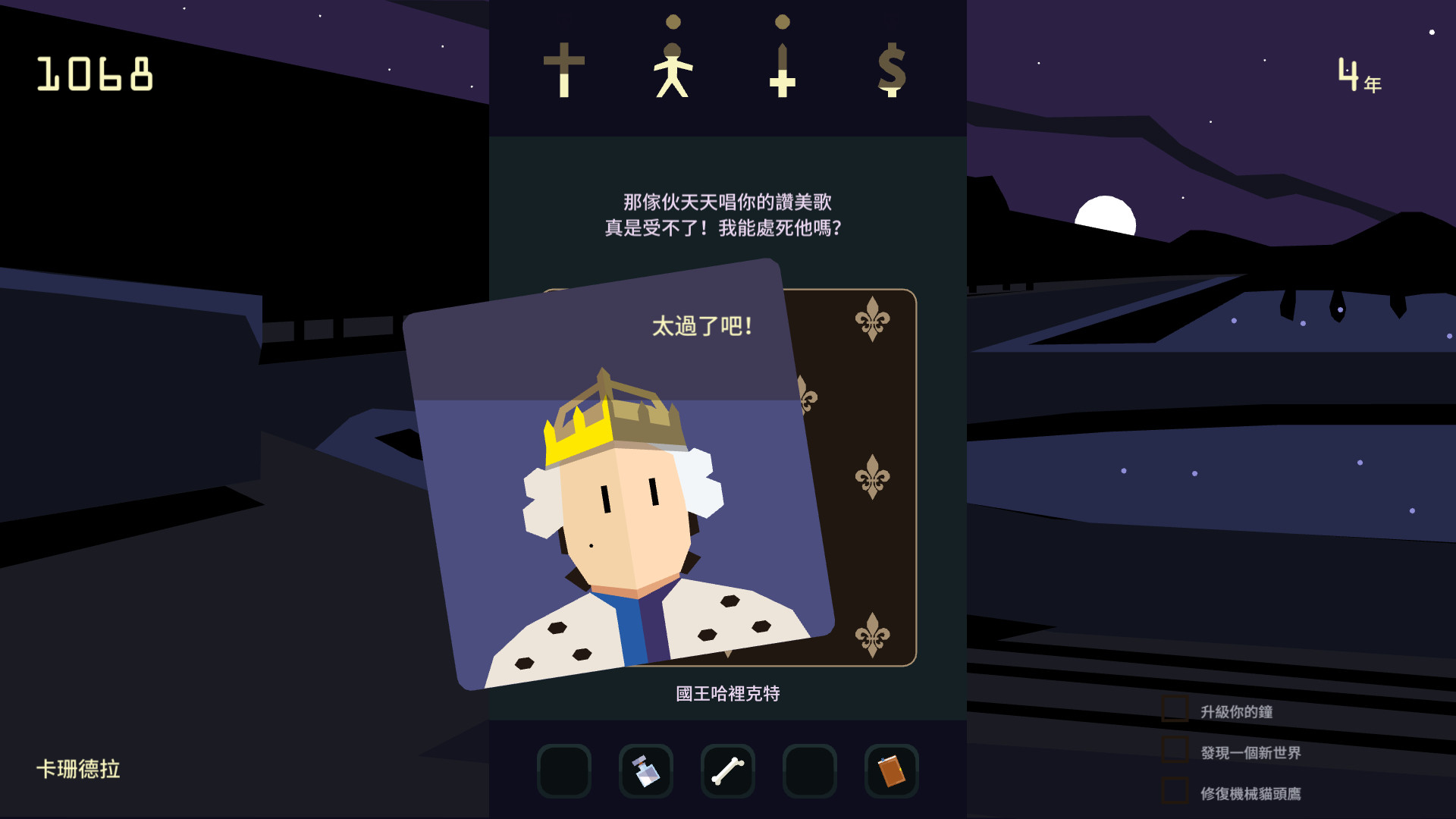 新的王國,新的劇情:身爲王后,如何應對王室條例,滿足難以預料的國民需求,將決定著您在位時間的長短,以及王朝的繁榮或覆滅;在愚昧的政治鬥爭與各類奇特的情感訴求中,您需要權衡利弊,謹小慎微地維持宗教、民生、軍事和財政四項指標的平衡。