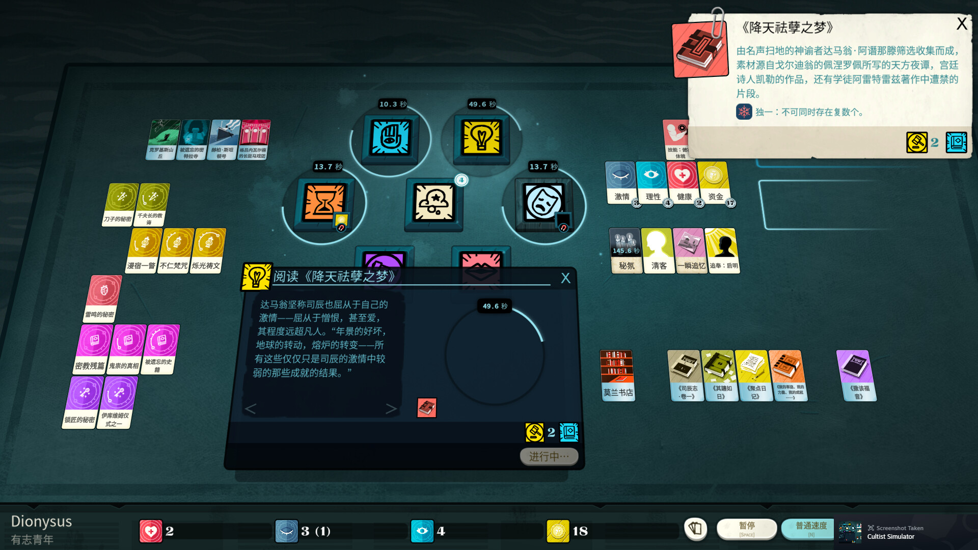 逐忌宝,唤异神,创密教。《密教模拟器 (Cultist Simulator)》是一款有关天启与渴慕的游戏,来自《堕落伦敦 (Fallen London)》与《无光之海 (Sunless Sea)》的制作人 Alexis Kennedy。玩家将扮演一名探索邪恶奥秘之人,而背景则设立在一个拥有隐世诸神与多重秘史的世界的1920年代。