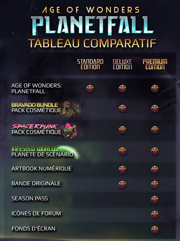 Age of Wonders Planetfall: Premium Edition propose l'expérience Planetfall intégrale et comprend le contenu de la Deluxe Edition, ainsi que le Season Pass, qui permettra aux joueurs d'accéder aux trois extensions prochaines et à une récompense instantanée.