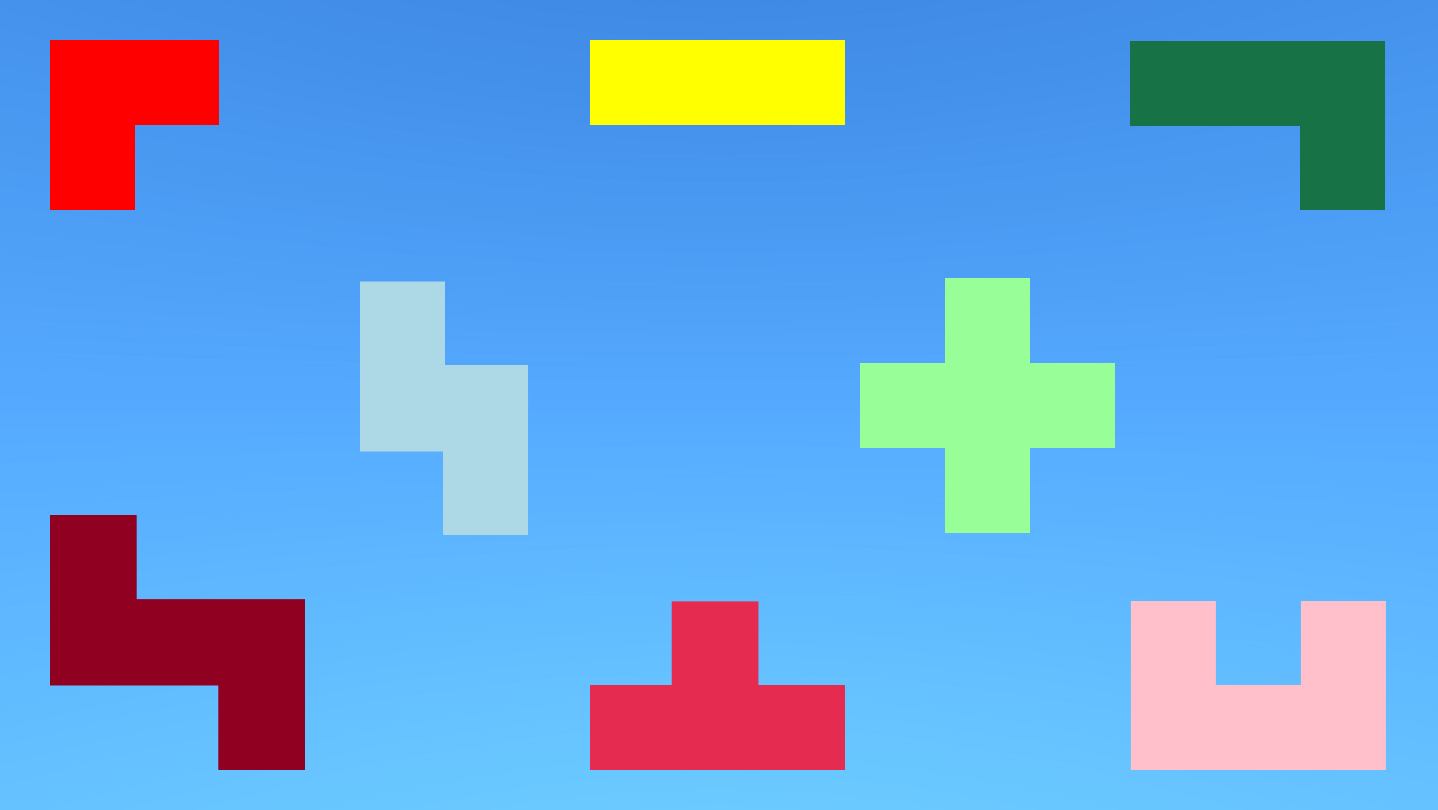 In the game you need to place sets of different shapes on the platform, in the way that all the shapes fit inside a bounded area of green color. All the shapes can be moved and rotated. Moving shapes is done simply by clicking and dragging the mouse.
