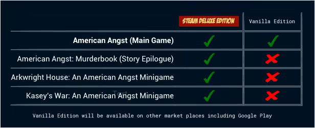 The Main Game in the Vanilla Edition is identical to the Steam Deluxe Edition. "Murderbook" is a short story epilogue that expands on what happens in the game. The Mini Games take place in the American Angst universe and won't be released separately: Arkwright House is a short haunted house game, Kasey's War is a short and snappy text-based shooter.