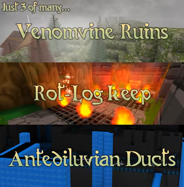 . Delve through a wide variety of dungeons that range from forgotten fortresses whose age-withered bricks are lost to moss and overgrowth, burrows consumed by the dead, and temple labyrinths created in honour of the star-soaring Evermore! There are loads.