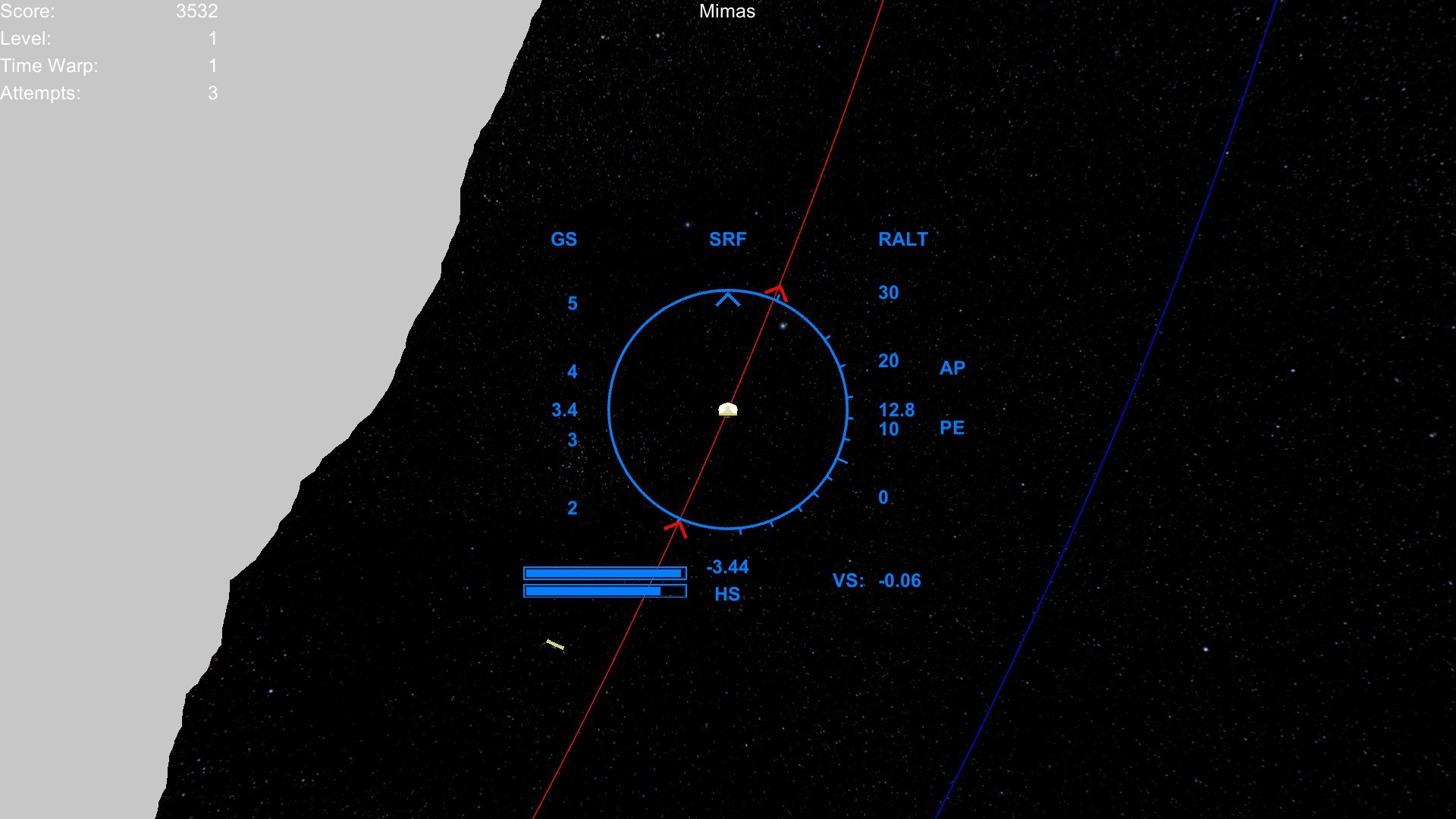 All of the game's mechanics are simulated with a full physics simulation that runs 1,000 times per second! This makes the 2D simulation very accurate and very realistic. There is no arbitrary rotation rate or acceleration. As you use-up fuel, your maximum acceleration will increase and you will be able to change your rotation rate more quickly.
