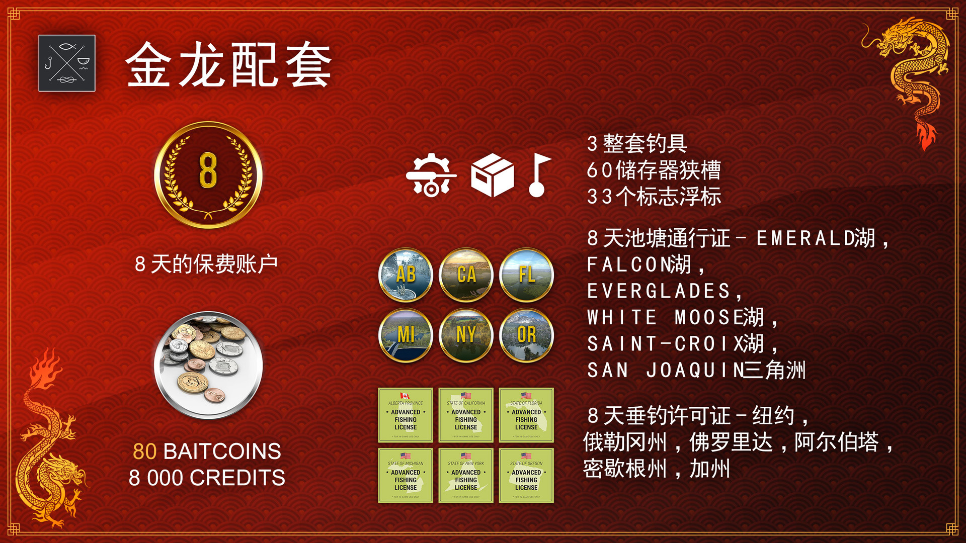 * 8 000 CREDITS —使用您的Credits购买新的钓具,支付垂钓行程,维修器械,以及完成其他游戏内的支付。按您的意愿使用您的Credits吧!