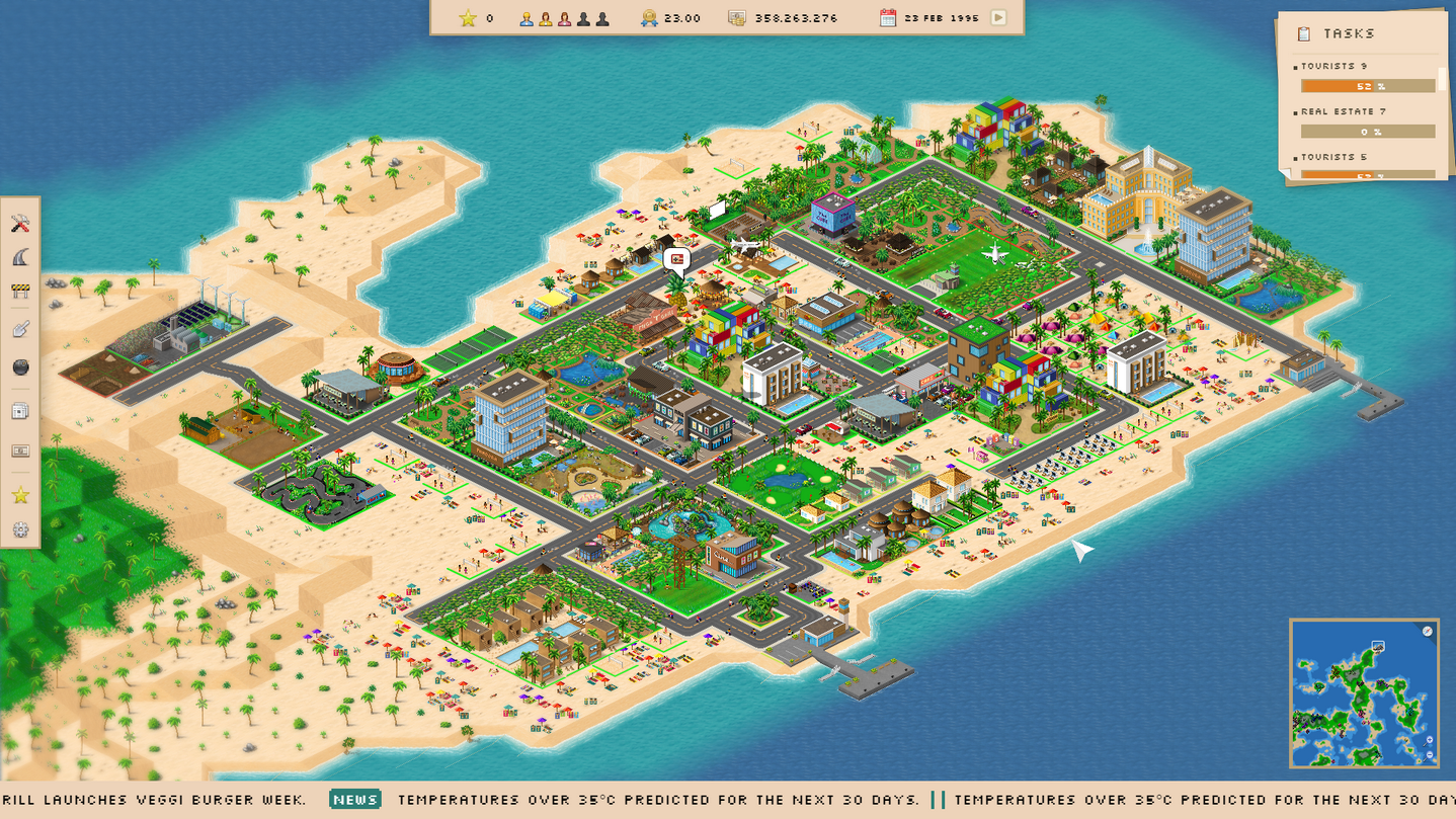 Buy new buildings from a wide range of building types. From houses and hotels to restaurants, stores, parks attractions etc. Here you can distinguish between mass tourists and luxury tourists. Buildings with luxury tourists earn you more money, but are expensive and have a lower capacity. Also note that mass tourists and luxury tourists have different preferences as to which buildings are nearby.