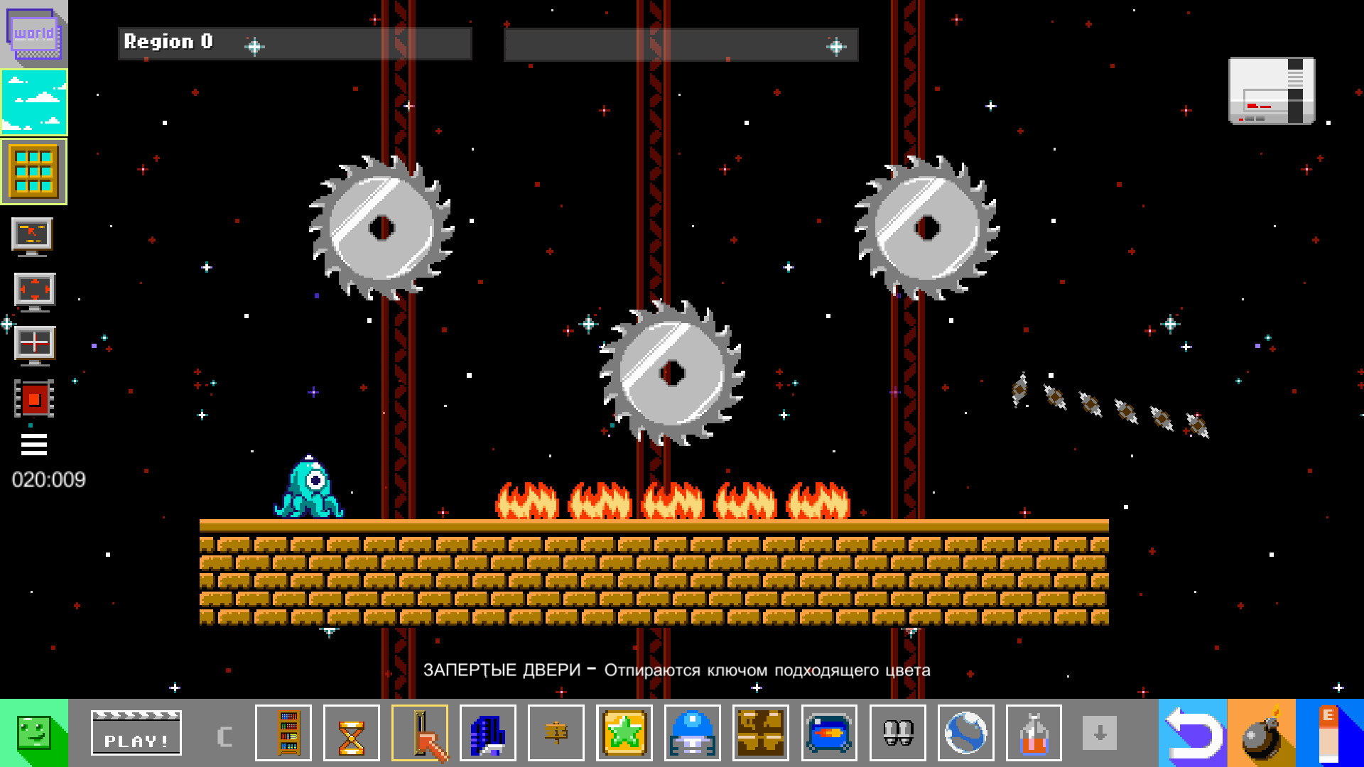 Конструктор предлагает широкий выбор готовых строительных блоков, врагов и объектов, так что вашему воображению будет где разгуляться! Используйте трамплины, телепорты и пушки, падающие и подвижные платформы, лазерные ловушки и реактивные ранцы.