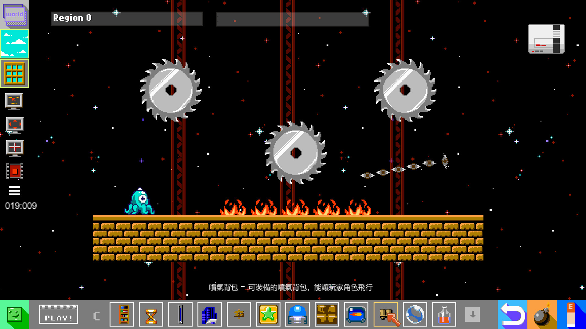 我們提供了豐富的瓷磚,敵人和關卡組件可供選用,任憑你發揮自己的想像力!這些組件既包括彈跳方塊,傳送器和大炮,也包括下落方塊,可移動平臺,鐳射陷阱乃至於噴氣背包。