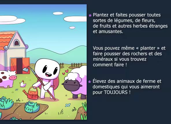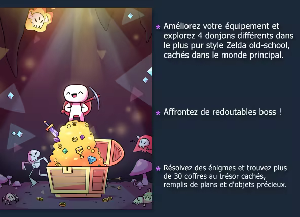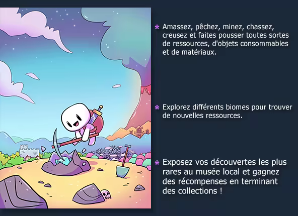 Forager est un jeu en open-world 2D inspiré par les jeux d'exploration, d'agriculture et de crafting comme Stardew Valley, Terraria et Zelda.