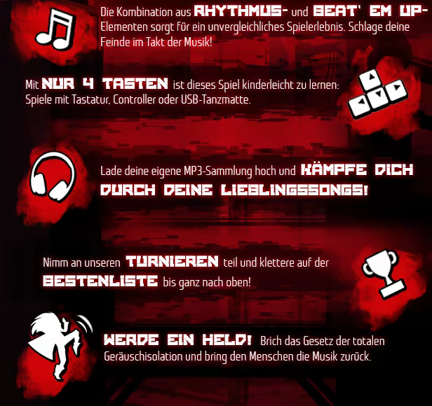 We are here to defy terror. Follow the rhythm to defeat the security systems that keep any sound from the society.