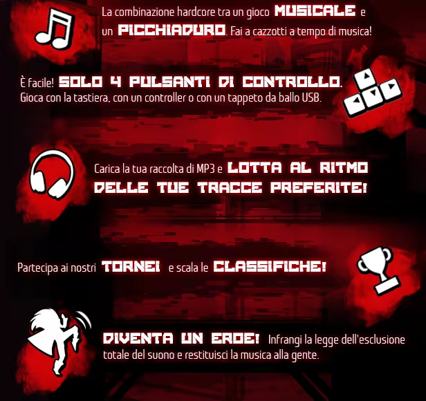 TERRORHYTHM - il picchiaduro musicale. Segui il ritmo della musica per sconfiggere i sistemi di sicurezza che vietano la musica nella società. Carica la tua raccolta di MP3 e lotta al ritmo delle tue tracce preferite!