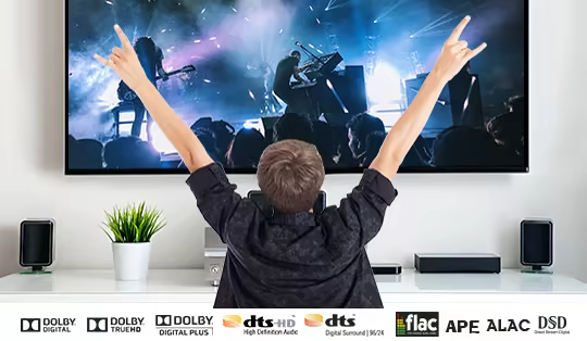 PowerDVD unterstützt Soundtechnologie in Master-Qualität von den Marktführern für professionelles digitales Audio: Dolby und DTS. Genießen Sie den akustischen Unterschied spezialisierten Multikanal-Audios und verlustloser Audioformate wie FLAC und DSD.
