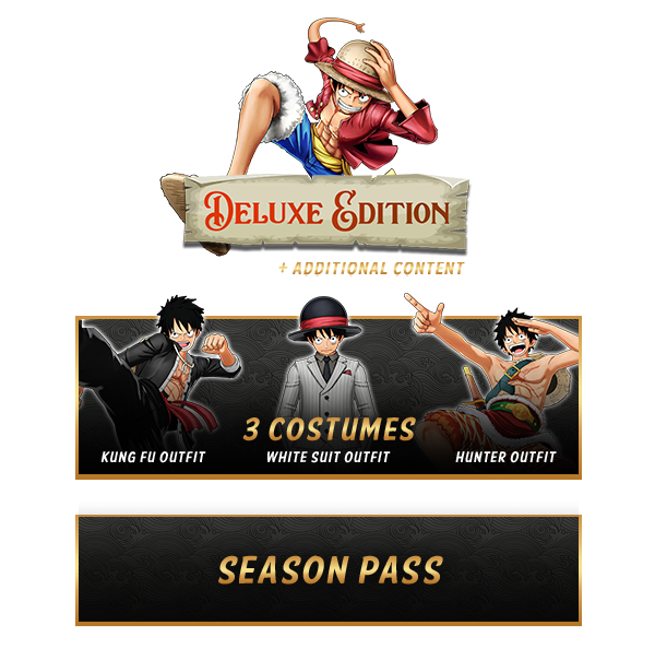 The ONE PIECE World Seeker Deluxe Edition includes the game and the Episode Pass, which contains 3 additional episode packs and bonus items.
