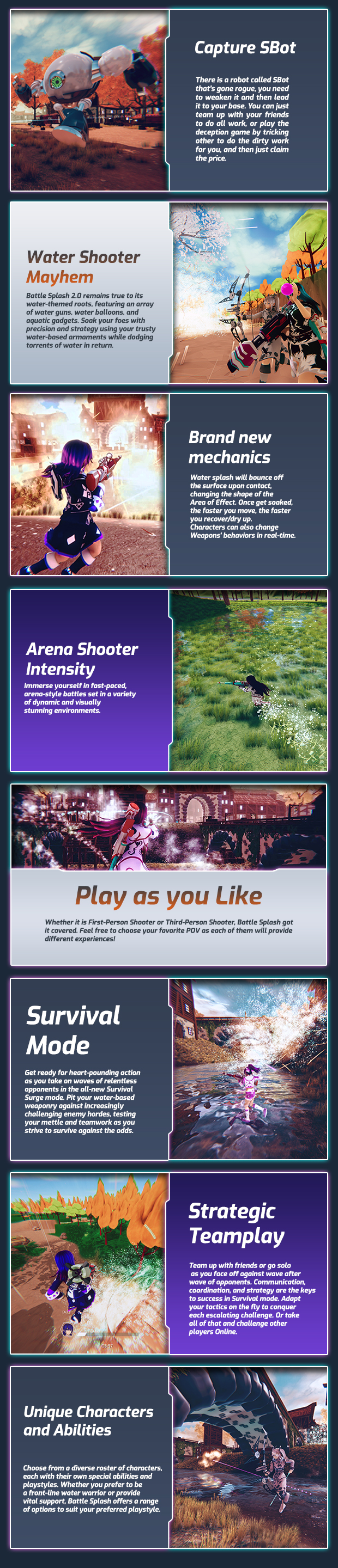 Inspired by Team Fortress 2, Arena Water Shooter, No Blood, No Violence, Family Friendly, Real Time Weapon Behaviour Switch, PvP, PvE, PvPvE, Roguelite Survival Mode, FPS and TPS FOV, Custom Lobbies, featuring Anime Girls Cast, Giant Robots, Skin Customization and lots Splashes.