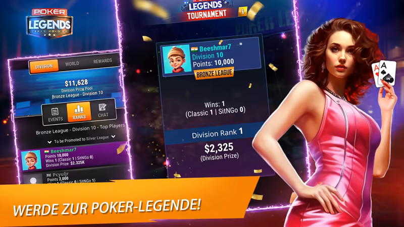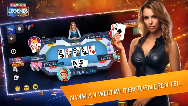 Poker Legends ist ein kostenloses Multiplayer-Texas-Hold'em-Spiel, bei dem du gegen echte Spieler bluffen, wetten und Strategien entwickeln kannst. Nimm an Turnieren teil, meistere Herausforderungen, schalte Belohnungen frei und beweise, dass du der ultimative Poker-Champion bist.