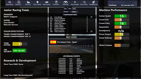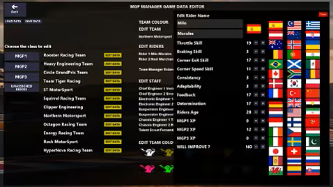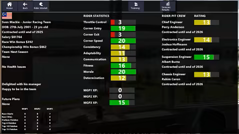 > Start your career with the entry level MGP3 machines or go full on with the MGP1 teams. There are hundreds of riders and staff to potentially sign to try to improve your teams performance.