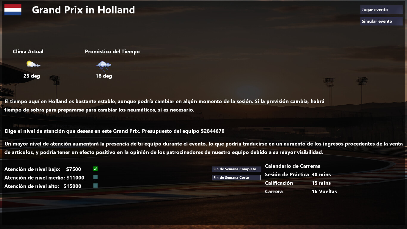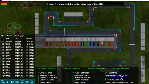 > Evolución de la Pista - al inicio de un evento, el circuito necesitará tiempo para "engancharse" para permitir que los pilotos establezcan sus mejores tiempos. La lluvia reduce el agarre del circuito incluso después de que la pista se haya secado, por lo que esto debe controlarse para garantizar que tus pilotos estén en la pista en el momento adecuado.