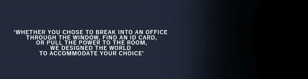 Whether you chose to break into a office through the window, find an ID card or pull the power to the room, we designed the world to accommodate your choice, approach and need to interact with objects you may or may not need for your research.