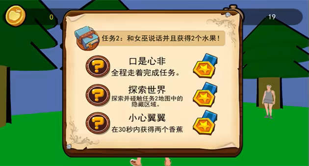 3.玩家通过移动、跳跃等方式使得游戏人物触碰场景中的水果,在获得水果后返回女巫处再次触发对话即可完成任务。