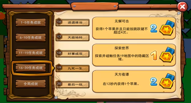 3.20个游戏场景,每个游戏场景包含1个任务,每个任务要求玩家在不同的场景收集水果,有的任务还要求玩家在收集水果的同时躲避"黑球"的追杀。