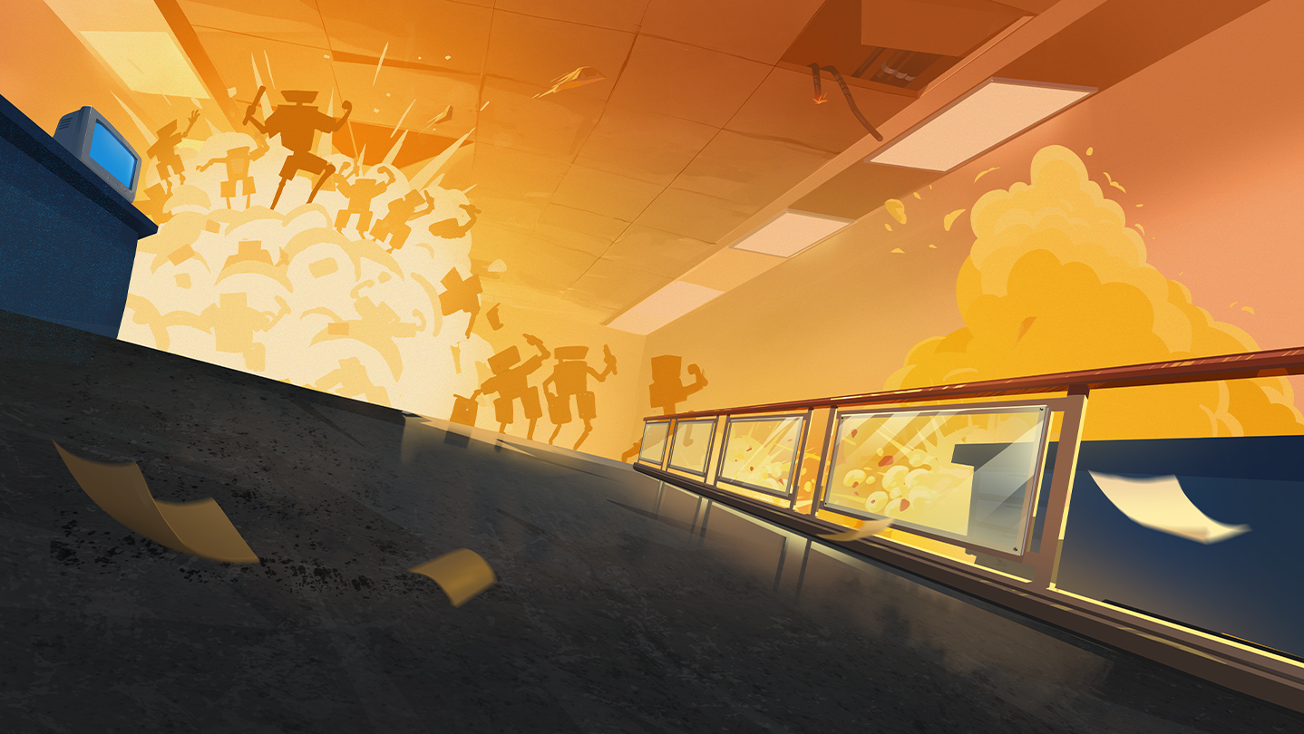 Стріляйте, рубайте й перемелюйте живу оргтехніку (чи реальних колег по роботі) у насиченому аренному спрощеному роуґ-подібному шутері, натхненому «нульовими»! Це хаотичне кулеметне пекло, адже з офісного крісла, що крутиться на всі 360, особливо не прицілишся.