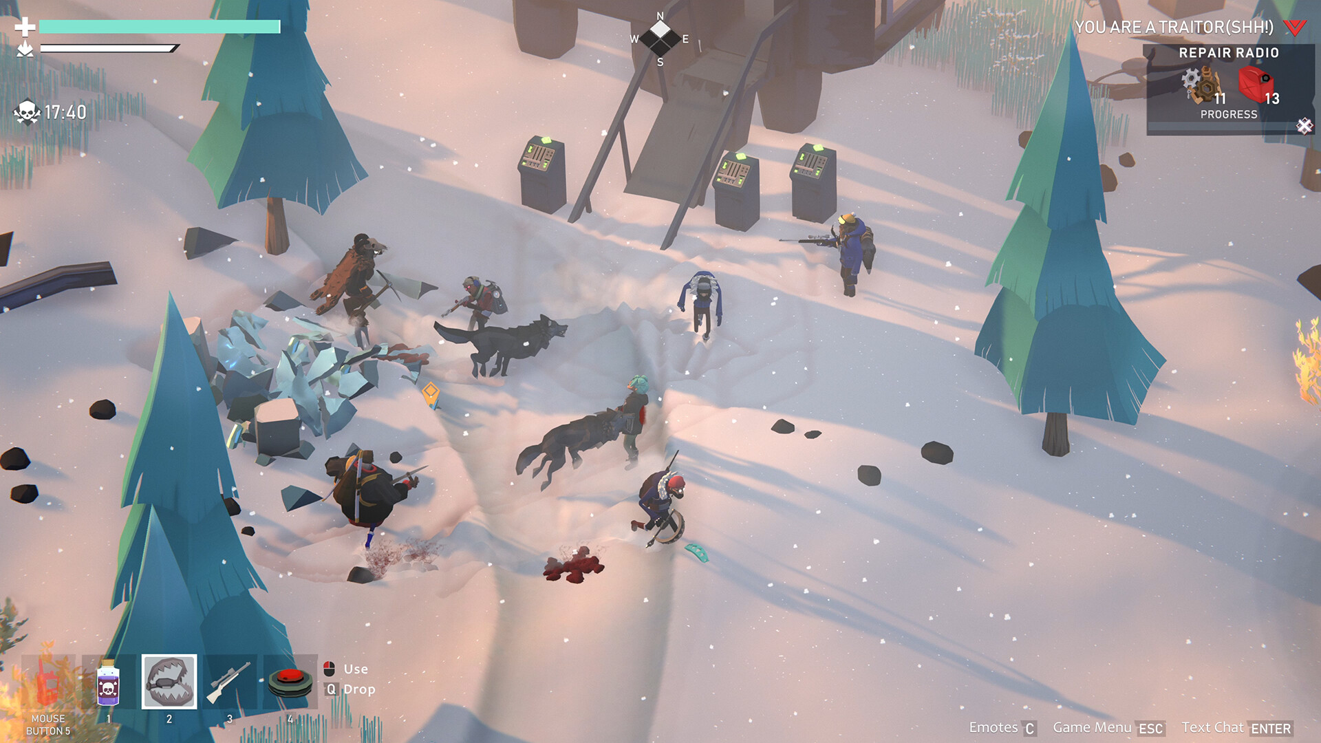 No two matches are ever the same. Whether you’re chopping firewood with allies, whispering over secret radios as a traitor, or panicking when a sudden blizzard forces everyone together, the tension builds with every decision.