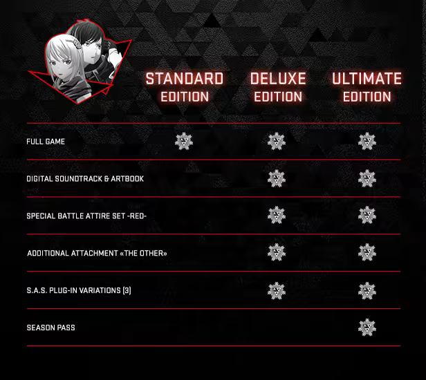 The Ultimate Edition includes the full game, Season Pass, Digital Artbook & Soundtrack, an Attire Set, an Additional Attachment, and Plug-ins.