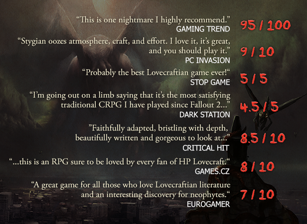 Delve into a role-playing game of horror, loss and madness set in the strange worlds of HP Lovecraft. Stygian: Reign of the Old Ones offers a mix of rich role-playing and turn-based tactical combat, represented in an illustrative visual style. Can you find salvation in a dead world?