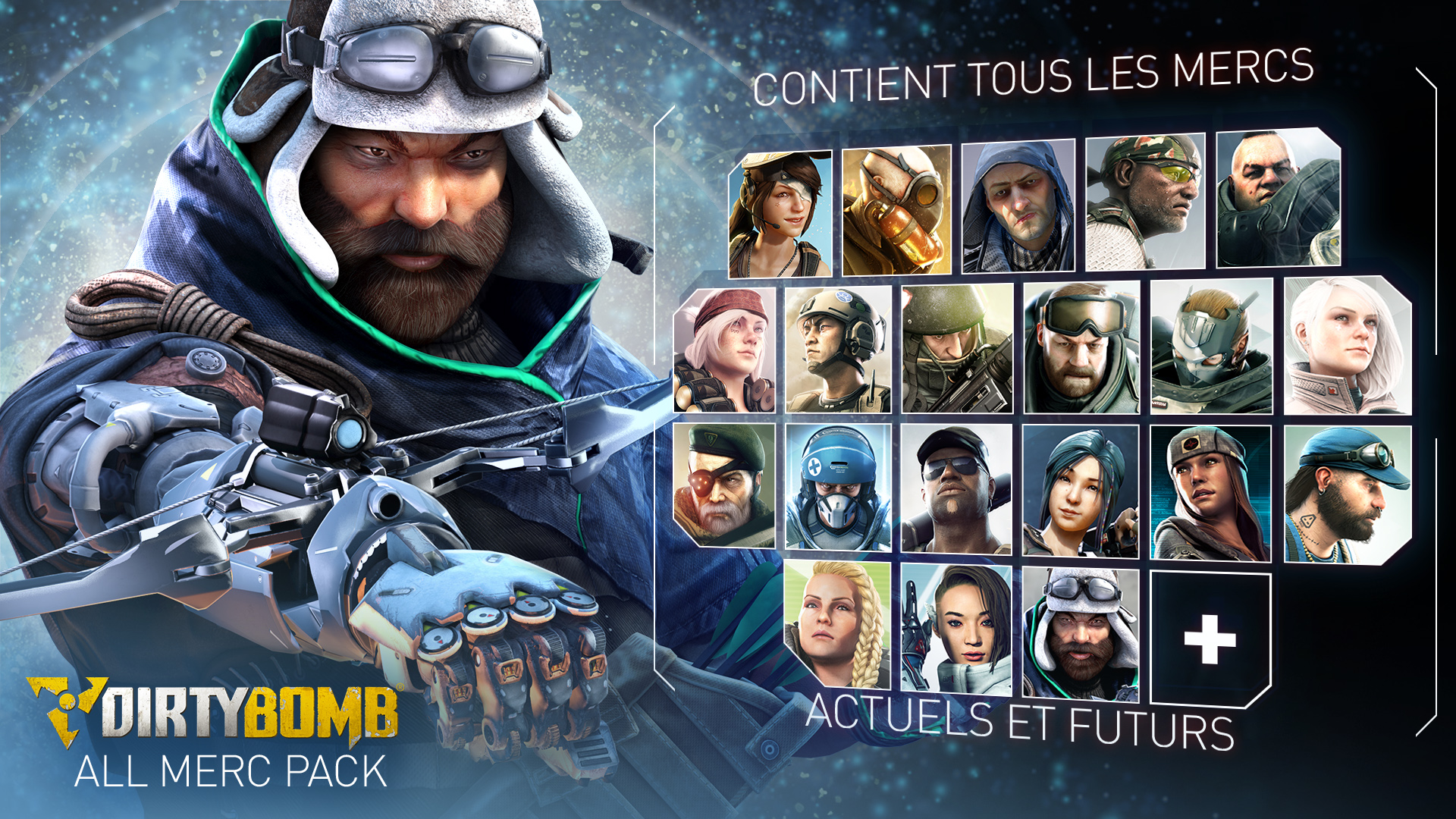 Remarque : à la demande de l'équipe d'édition, Dirty Bomb - All Merc Pack n'est plus listé sur le magasin Steam et n'apparaitra plus dans les résultats de recherche.