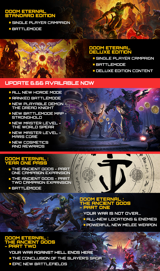 Includes DOOM Eternal: The Ancient Gods - Part One and The Ancient Gods - Part Two campaign expansions and DOOM Eternal BATTLEMODE