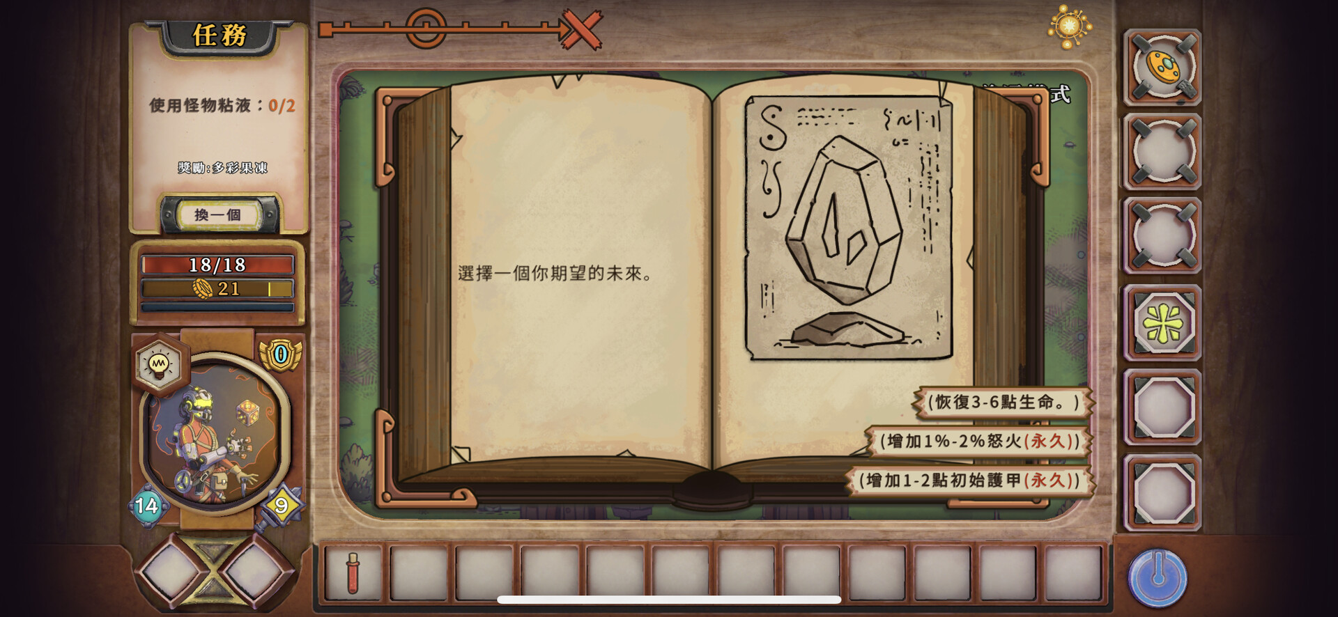 每次前進以及遭遇某些事件時會消耗體力,當體力為0時會發生一些負面事件,所以記得喂飽自己吧。