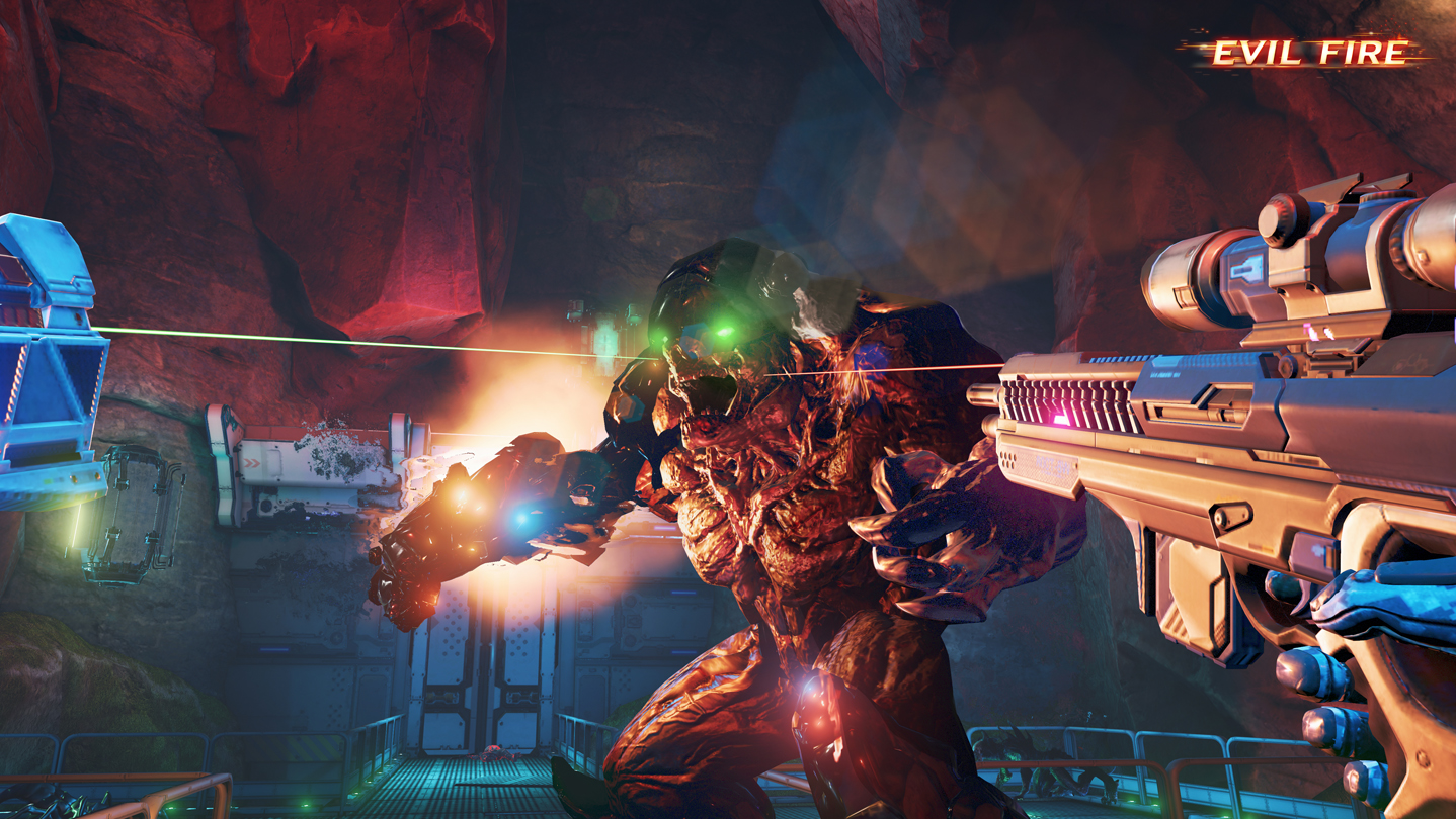 EVIL FIRE is a VR exclusive game. You can experience thrilling encounters while fighting unknown life forms that lurk around the base. Complete the mission given to you by the Allied Forces while defeating unknown life forms.