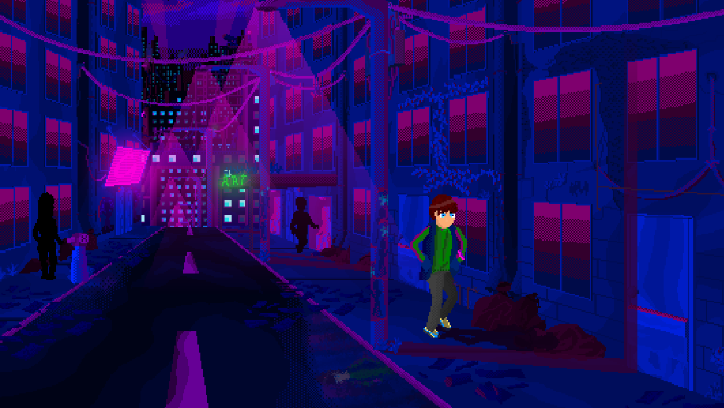 The game’s art style of blue and purple, represent not just the 80/90s feel of the game but also social isolation. Some items in the game that hold great importance to the main character are not in blue/purple but are in full color, because of how important they are.