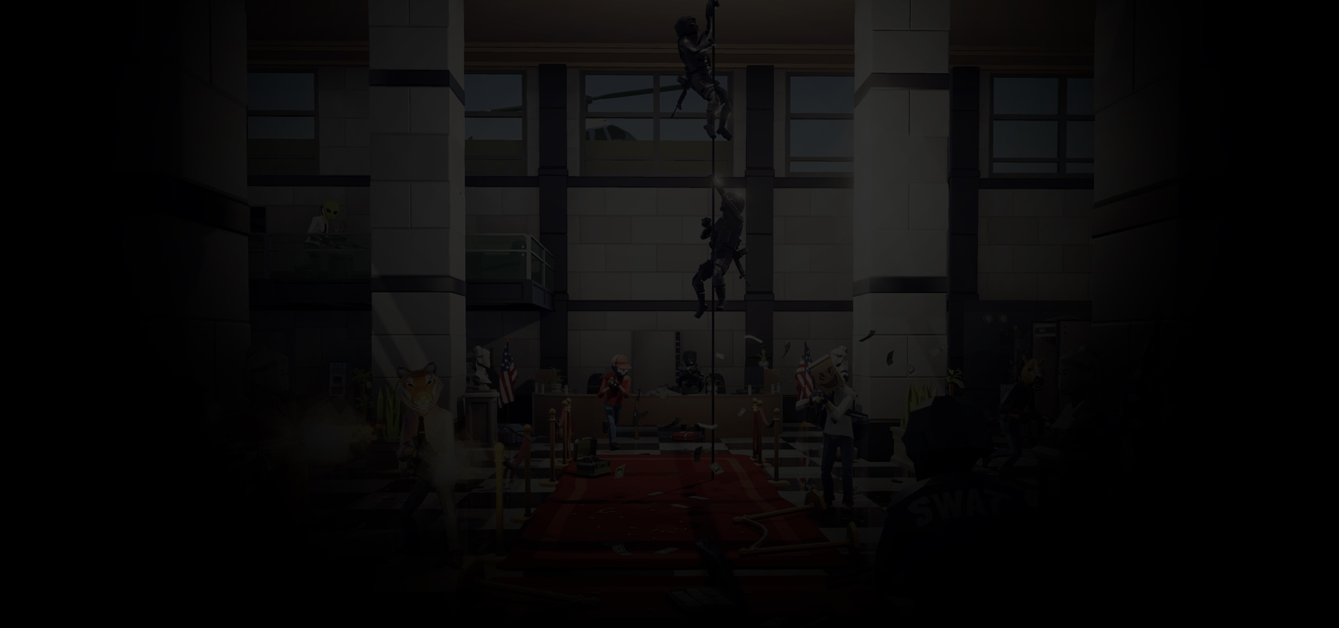 The robbers have to blend in with a crowd of NPCs to not get shot by cops, while somehow smuggling explosives inside the bank, stealing money, and then getting away with it. They have a variety of options to pull off the perfect heist, for example, they can: