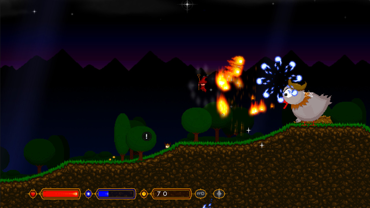 You're a red wizard. On an island. Jump around. Shoot fireballs. Cast shield and other spells. Defeat a viking chicken and other fearsome enemies.
