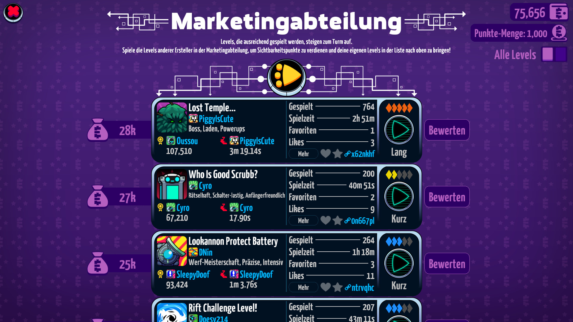 • Gewinne Follower! Veröffentliche dein Level in der ganzen Welt und beobachte, wie sich die Spielzeit, Versuche und Follower anhäufen. Mit einer leistungsstarken Suche und Kuratierung macht Levelhead das Sammeln von Followern und das Spielen von endlosen benutzergenerierten Inhalten aus der ganzen Welt zum Kinderspiel. Außerdem kannst du in der Marketing-Abteilung deine Levels allein durch das Spielen an die Spitze der Charts bringen, was bedeutet, dass du nicht schon berühmt sein musst, damit deine Levels gespielt werden!