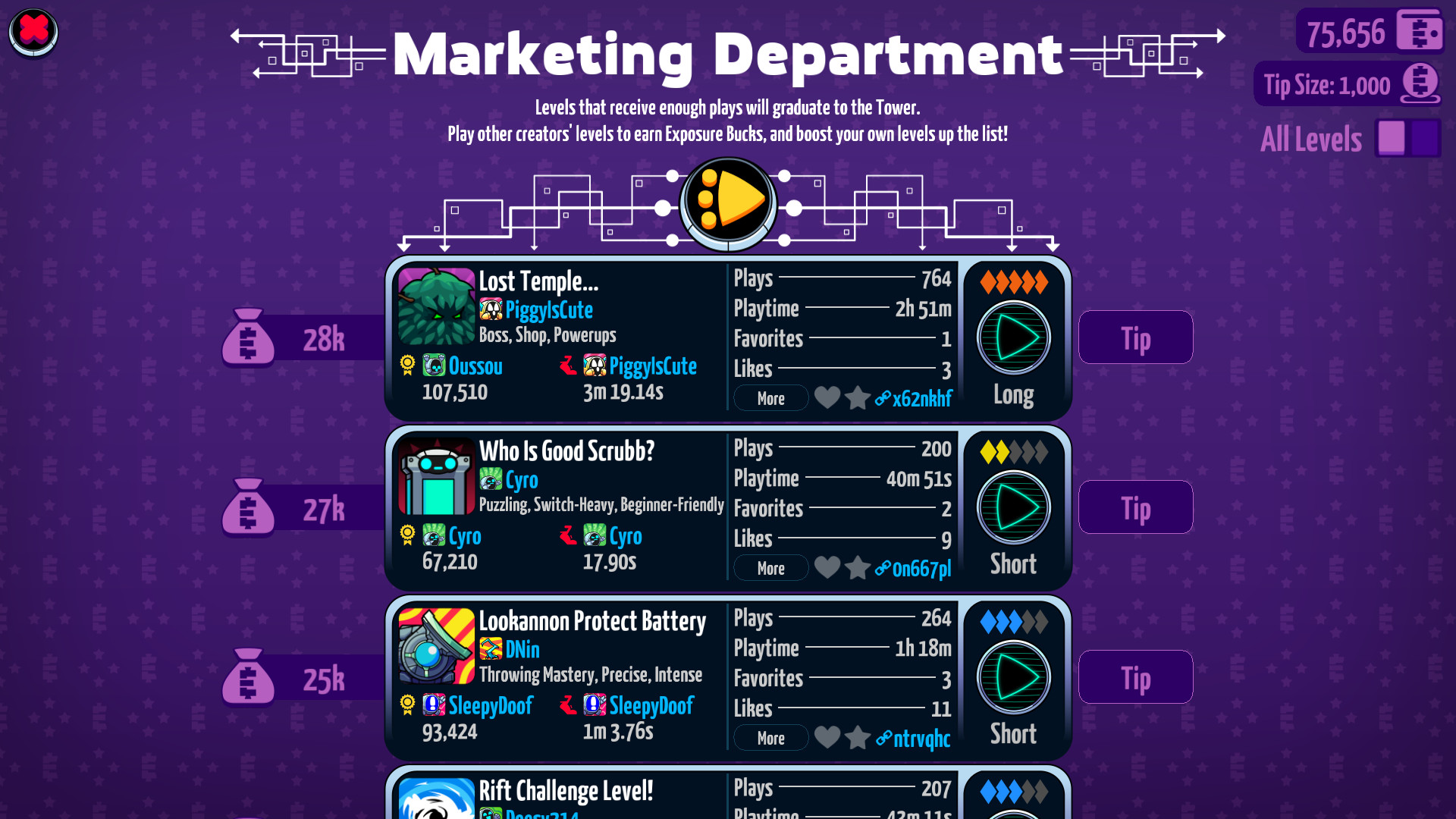 • Gain a following! Publish your Level to the entire world and see your Play Time, Attempts, and Followers stack up. With robust search and curation, Levelhead makes collecting followers and playing endless user-generated content from around the world a breeze. Plus, the Marketing Department lets you push your Levels to the top of the charts just by playing the game, meaning you don't already have to be famous to get your Levels played!