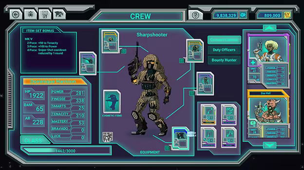 Extensive Loot Collection – With thousands of items to collect, BRIG 12 offers an abundant amount of space loot. Each item has varying rarity and stats and can equip your crew, provide them skills and attacks, or help craft augments to aid in battle. Loot is earned during battles or turning in bounties. You can also sell loot for credits or salvage them for new items to help manicure your collection.