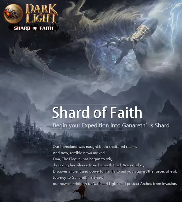 The first expansion to Dark and Light, Shard of Faith, features Adventurers’ expedition to Ganareth’s Shard for the purpose of stopping the corruption that encroaches mother planet Gaia. Adventurers will uncover new power of mysterious Faith, and fight against the forces of darkness with the help of ancient God and deities.