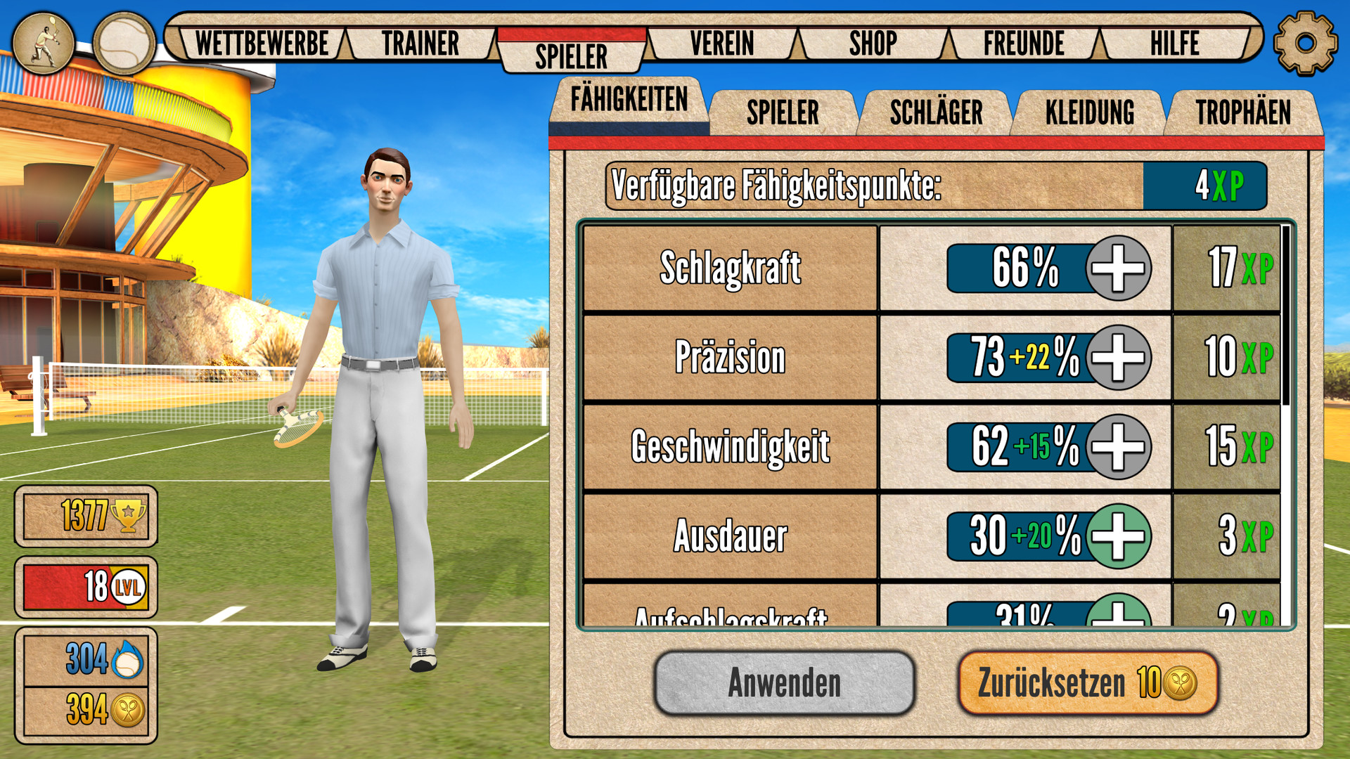 • Passe deine Figur individuell an und entwickle sie weiter, sodass sie ein richtiger Tennisprofi wird.