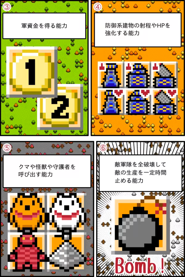 • Bomb:敵軍隊を全破壊して、敵の生産を一定時間止める能力。