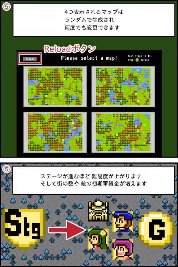 • 4つ表示されるマップはランダムで生成され、何度でも変更できます。