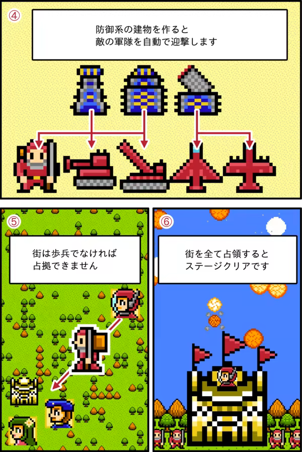 8bit風RTS! スピード ボタンで高速クリア、1ステージ5~10分ほどでクリアできます。操作は簡単です。自軍は赤色です。生産系建物を配置すれば軍隊を自動生成、防御系建物を配置すれば軍隊を自動迎撃します。マップ上の全ての街を占拠すればステージクリアで、建物や特殊能力を獲得できます。