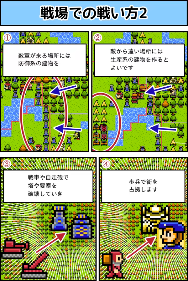 • 戦車や自走砲で塔や要塞を破壊していき、歩兵で街を占拠します。
