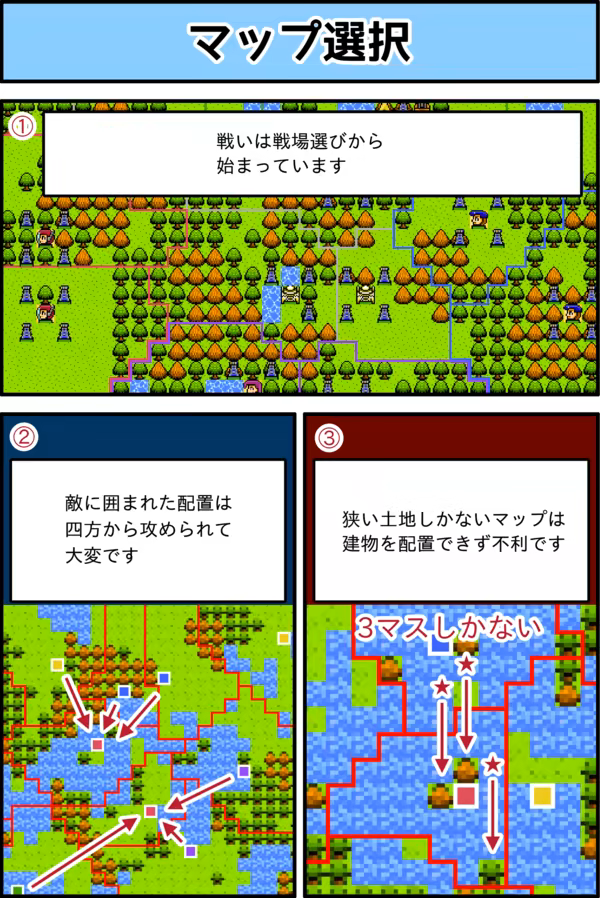 • 狭い土地しかないマップは、建物を配置できず不利です。